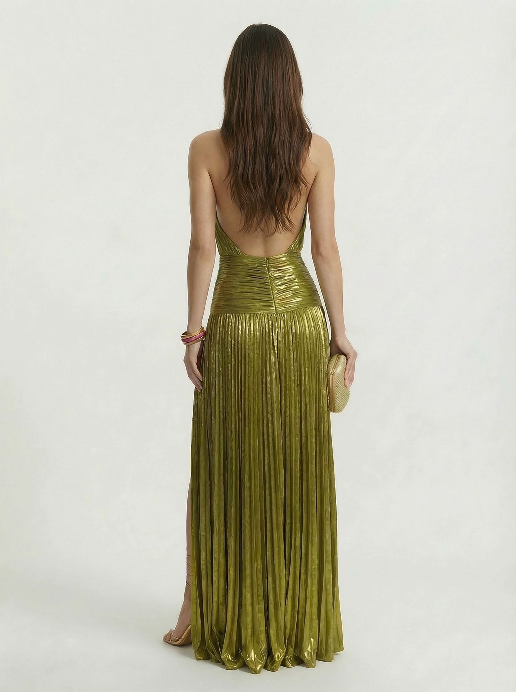 Designed for evening wear and special occasions, this metallic halter maxi dress features a softly pleated finish that moves fluidly with each step. The lightweight feel and balanced silhouette make it a refined choice for formal events, celebrations, and seasonal gatherings.